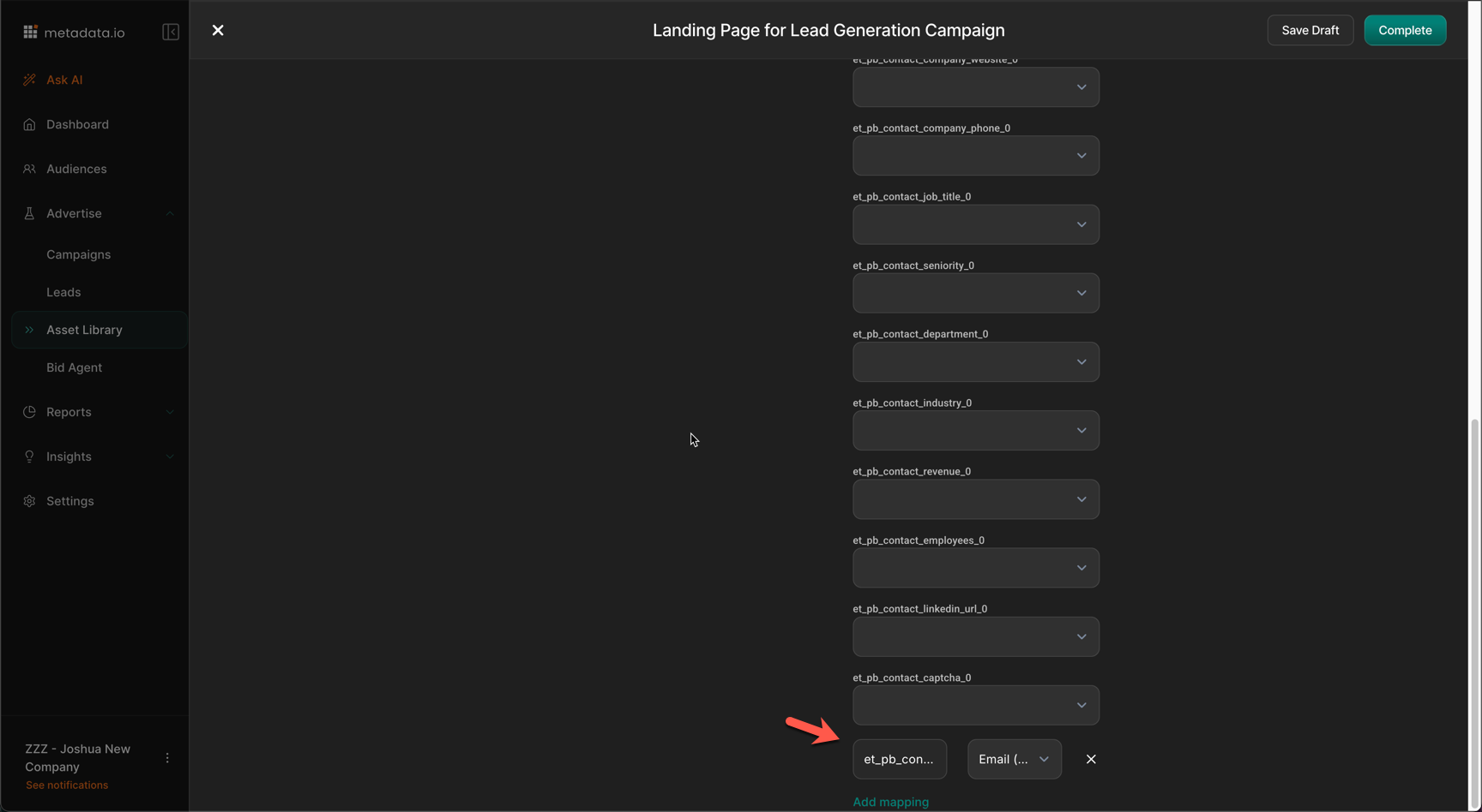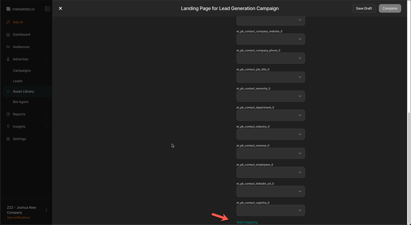 We will attempt to detect the fields automatically on your Landing Page, but in some cases we won't be able to retrieve them and you may need to use "Add mapping" which requires manually mapping the field:
