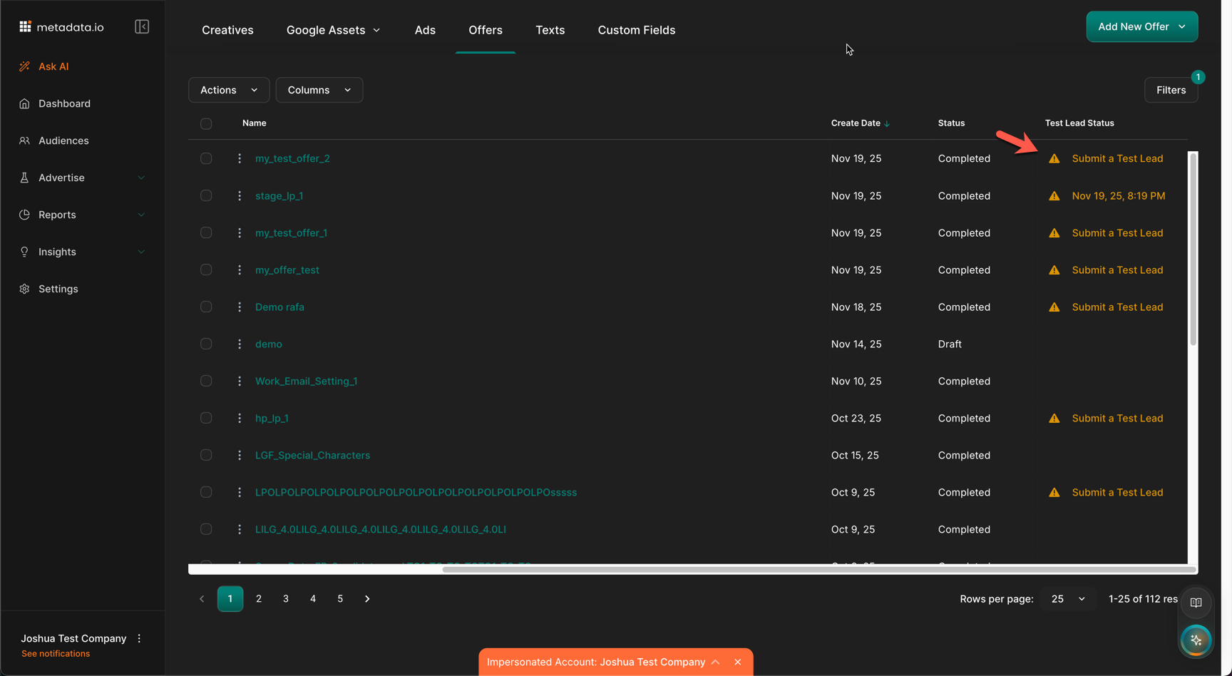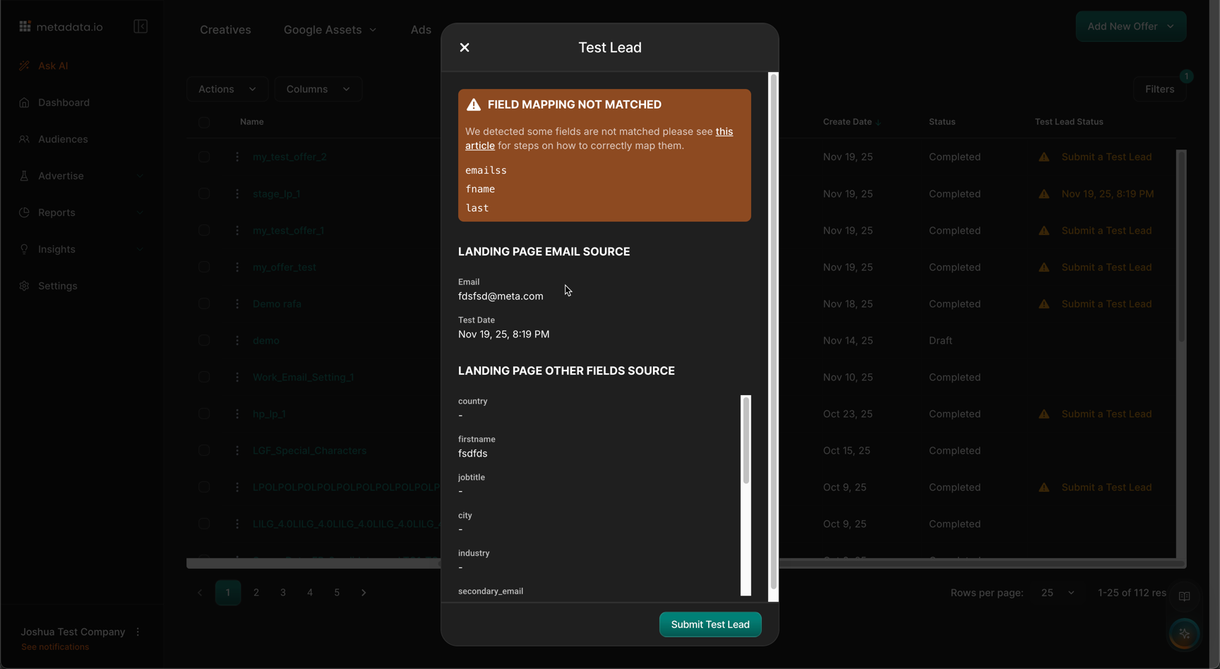 After successfully creating the Offer, run a test to ensure there are no issues with the field mapping: